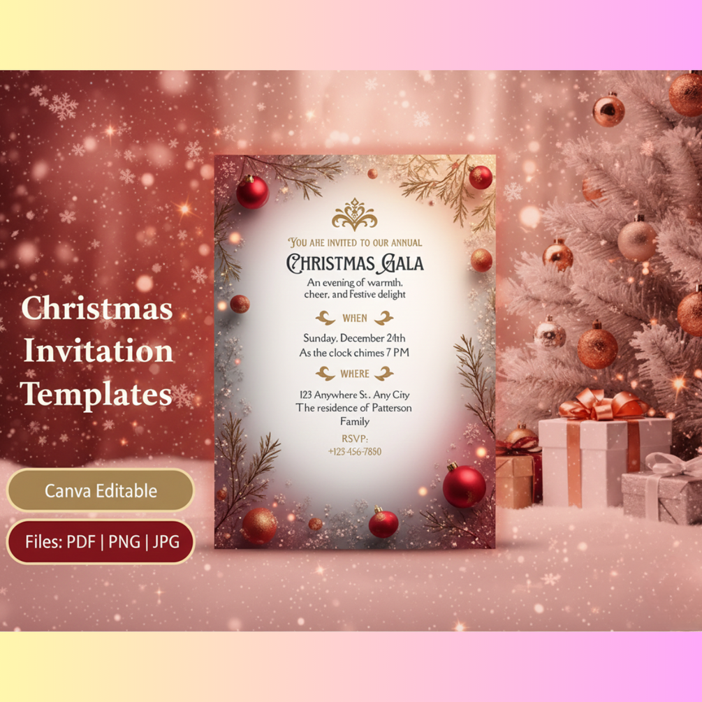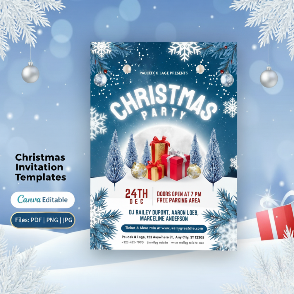 Make your holiday events magical with this stunning bundle of editable Christmas invitations.